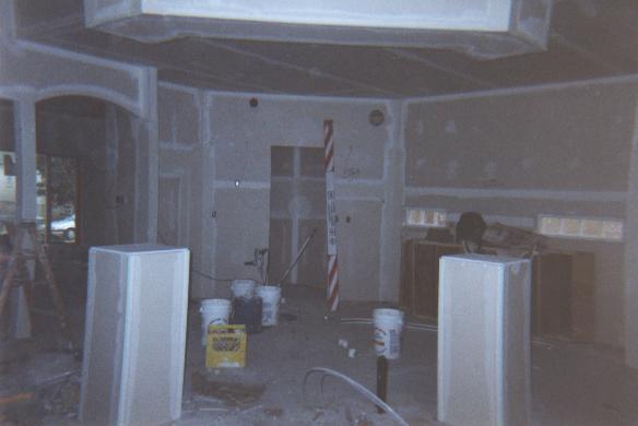 Here's the kitchen after the drywalling has been done. The bulkhead is now attached to the ceiling, and the base of the raised eating bar has been built.